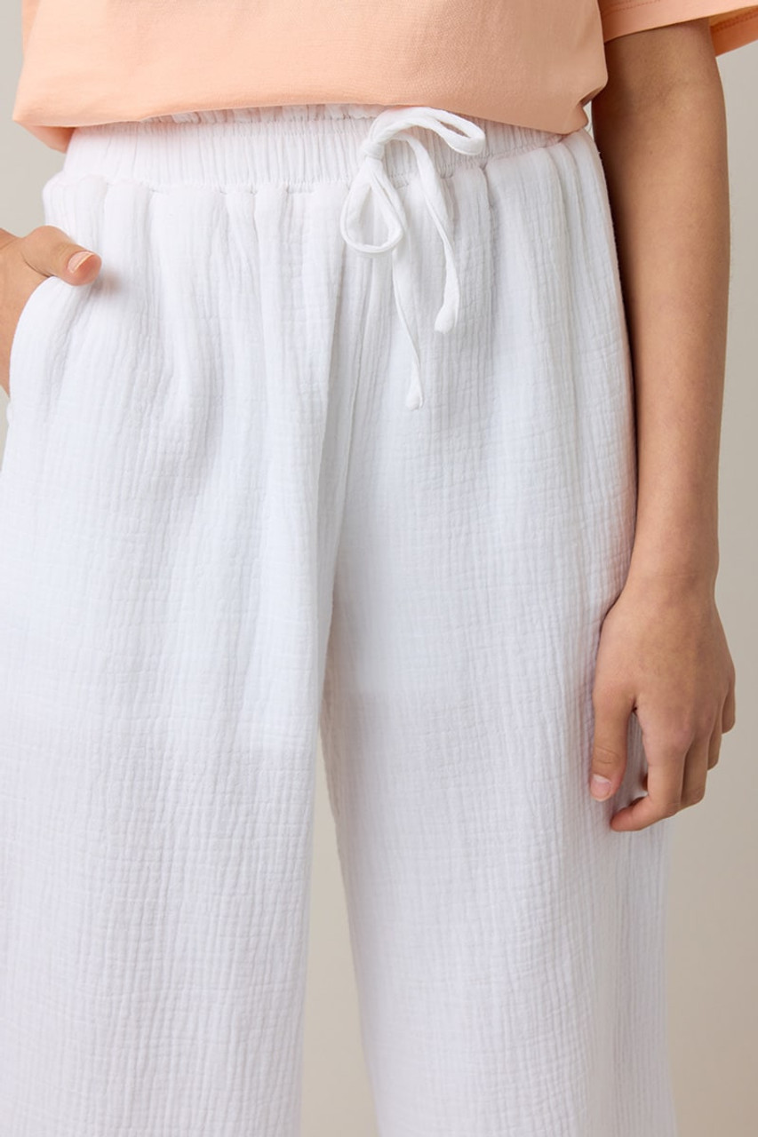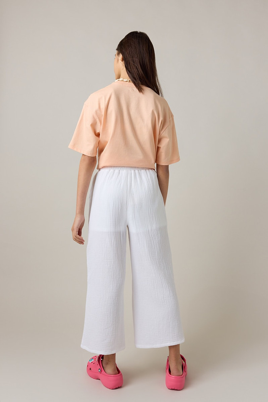 – Elastic waist, short lining, cropped pant in a comfy gauze fabric.