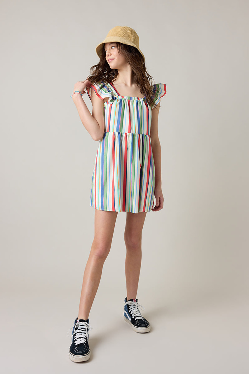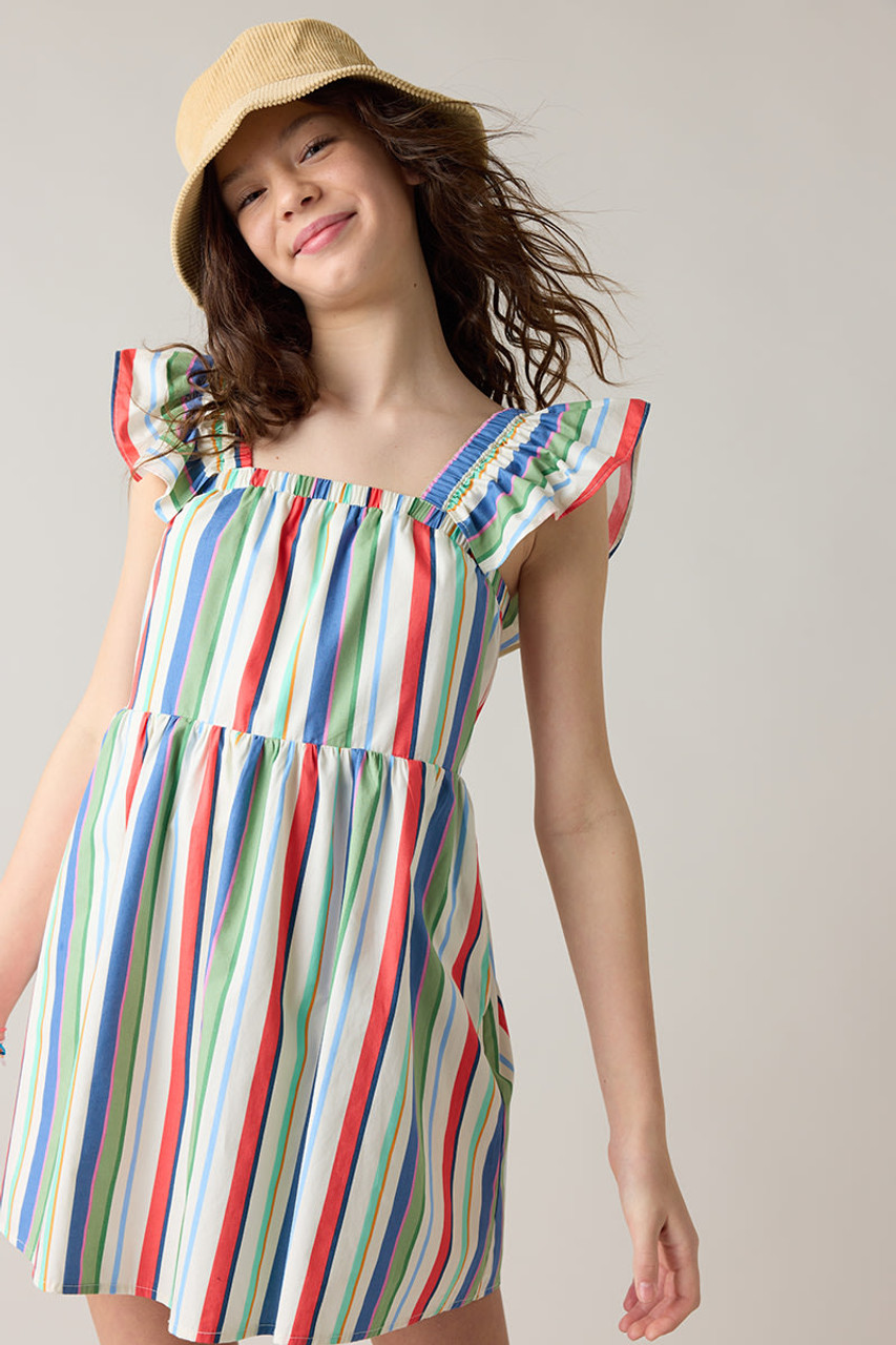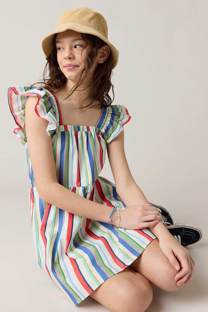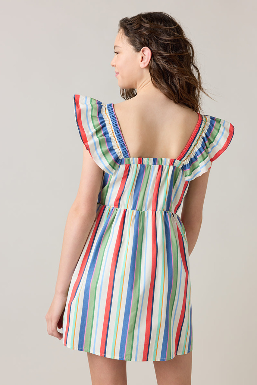– Multi striped dress with flutter sleeves and an elastic waist for comfort.