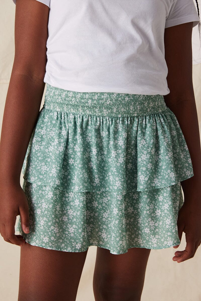 – Elastic waist, two tiered ruffle skirt in a ditsy floral print