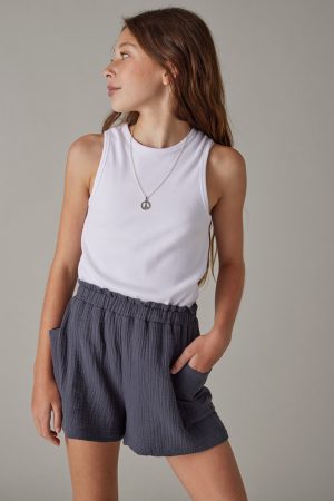 – Pull -on style with a smocked waist line and comfy/light weight gauze fabric.