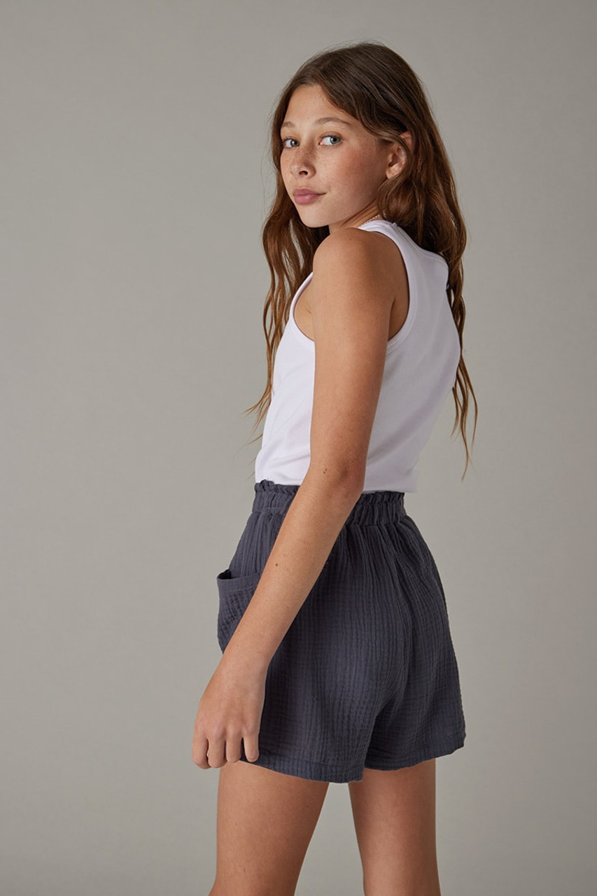 – Pull -on style with a smocked waist line and comfy/light weight gauze fabric.