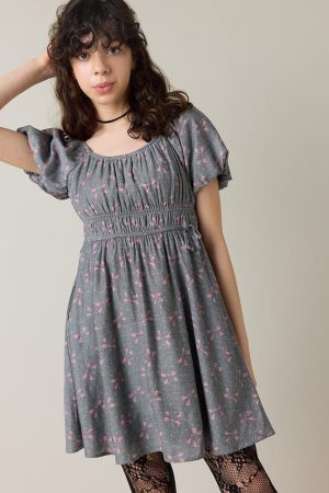 – Puff sleeve dress that features a peasant style bodice and a bow print all over.