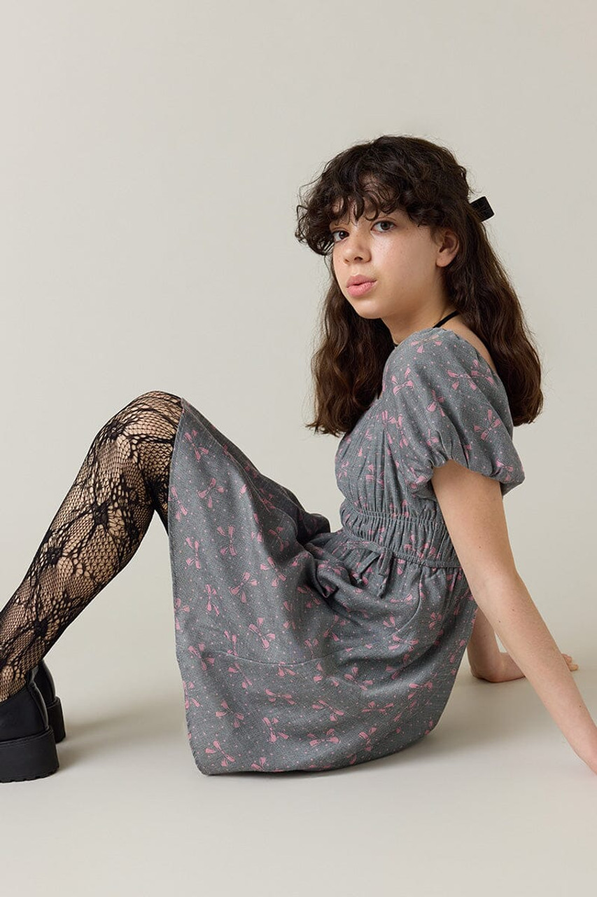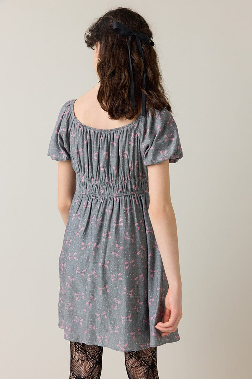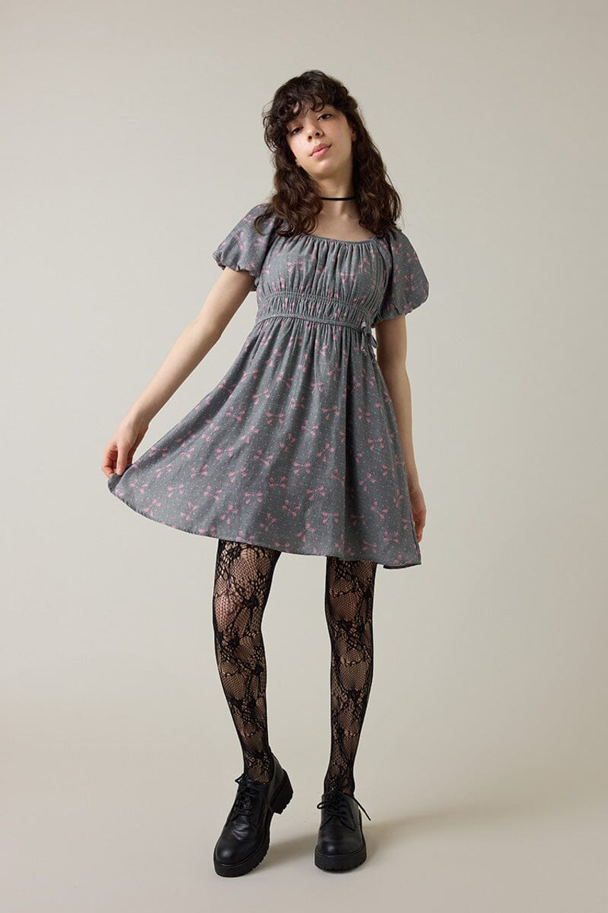 – Puff sleeve dress that features a peasant style bodice and a bow print all over.