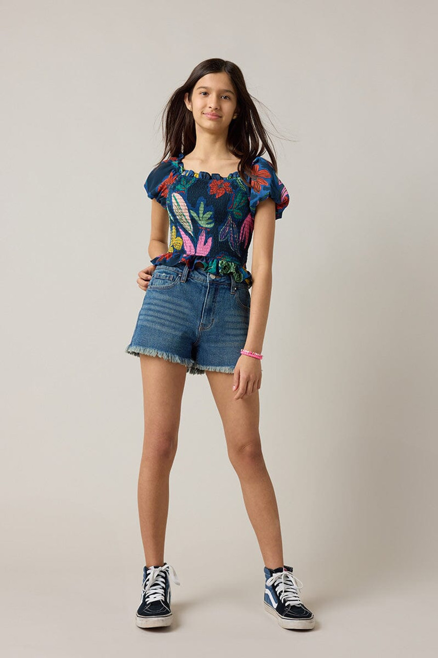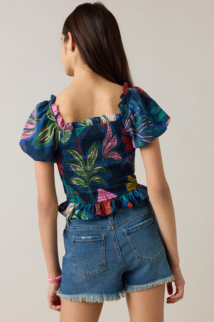 – Puff sleeve, smocked bodice, cropped blouse.