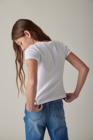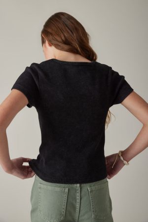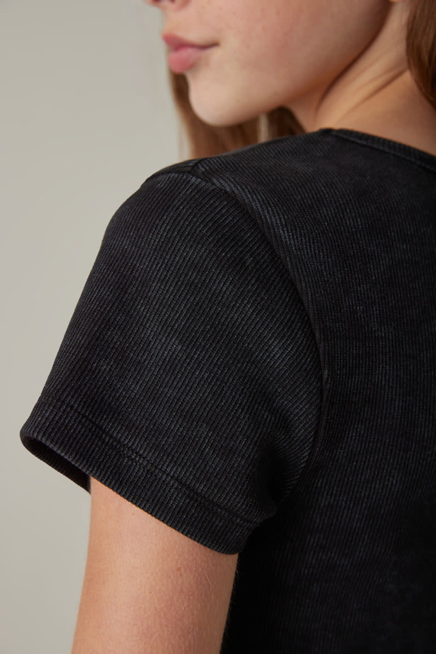 – This elevated basic is an upgrade to your favorite tee. Featuring a ribbed fabric for comfort.