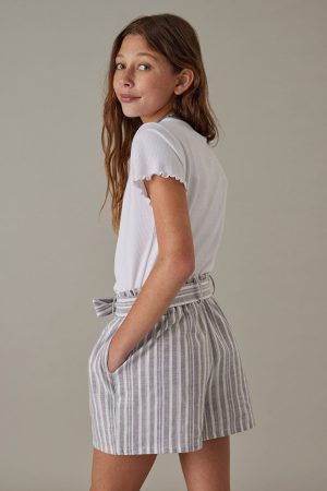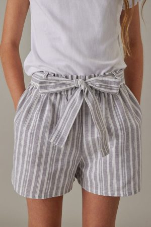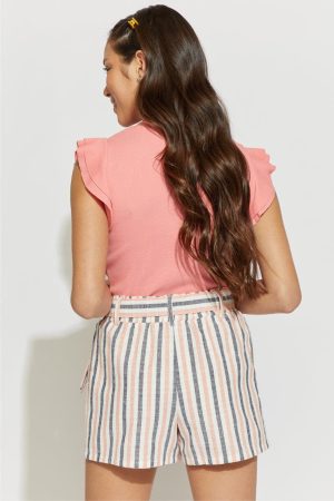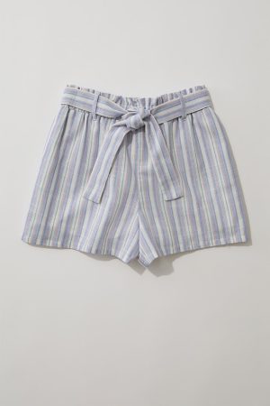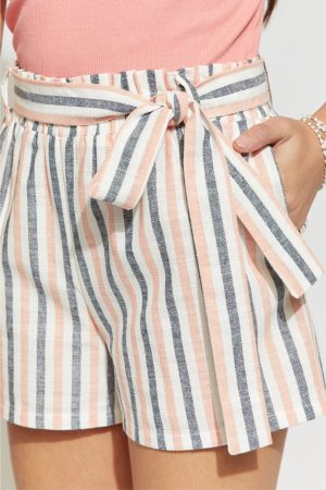 – Striped print, flowy short, with a self tie belt.